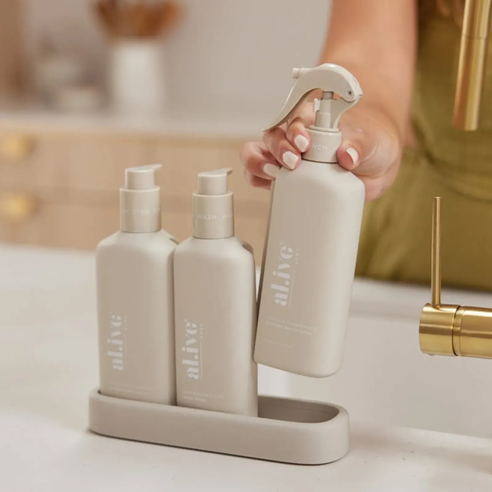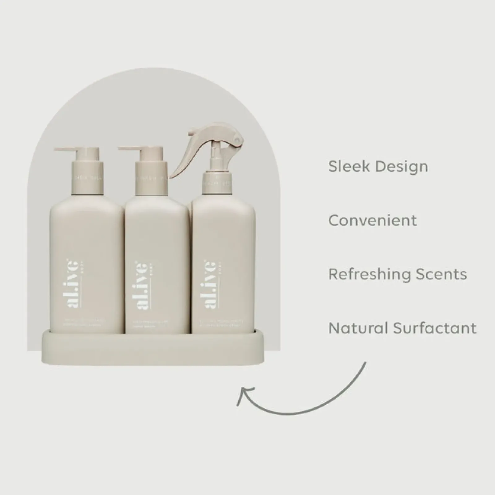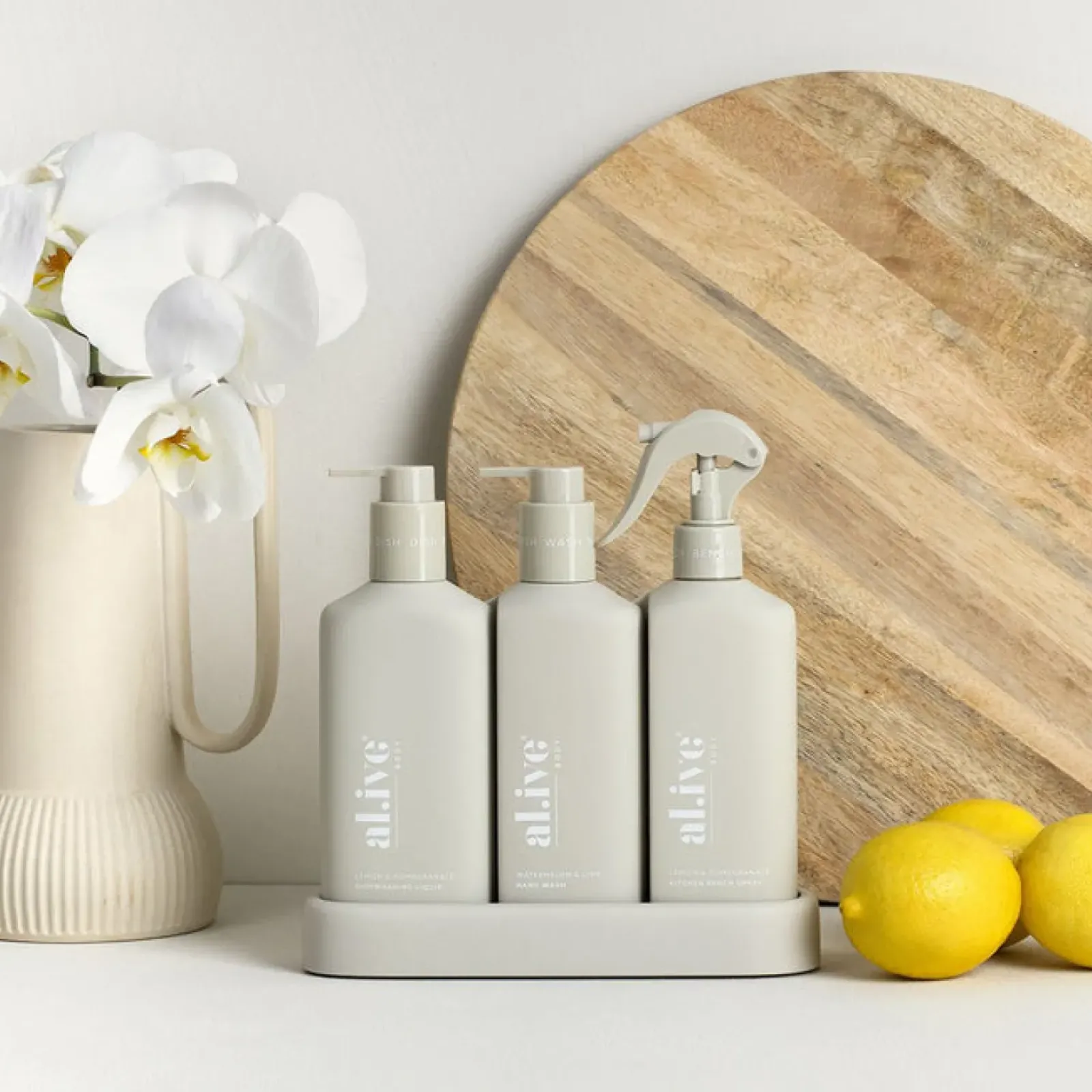The al.ive body Dishwashing Liquid, Hand Wash & Bench Spray + Tray Premium Kitchen Trio is a beautiful yet practical product, elegantly packaged to elevate your countertop.