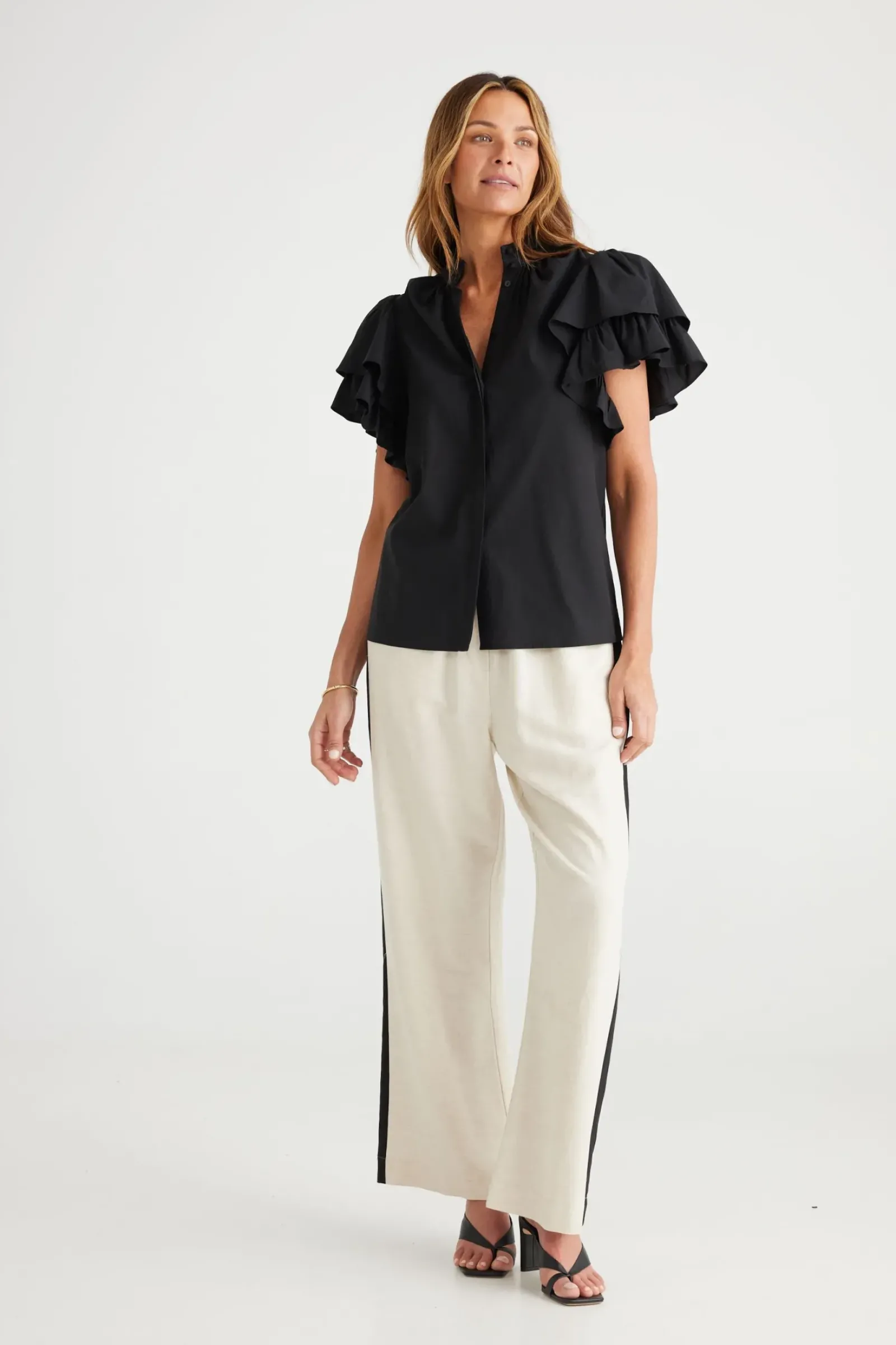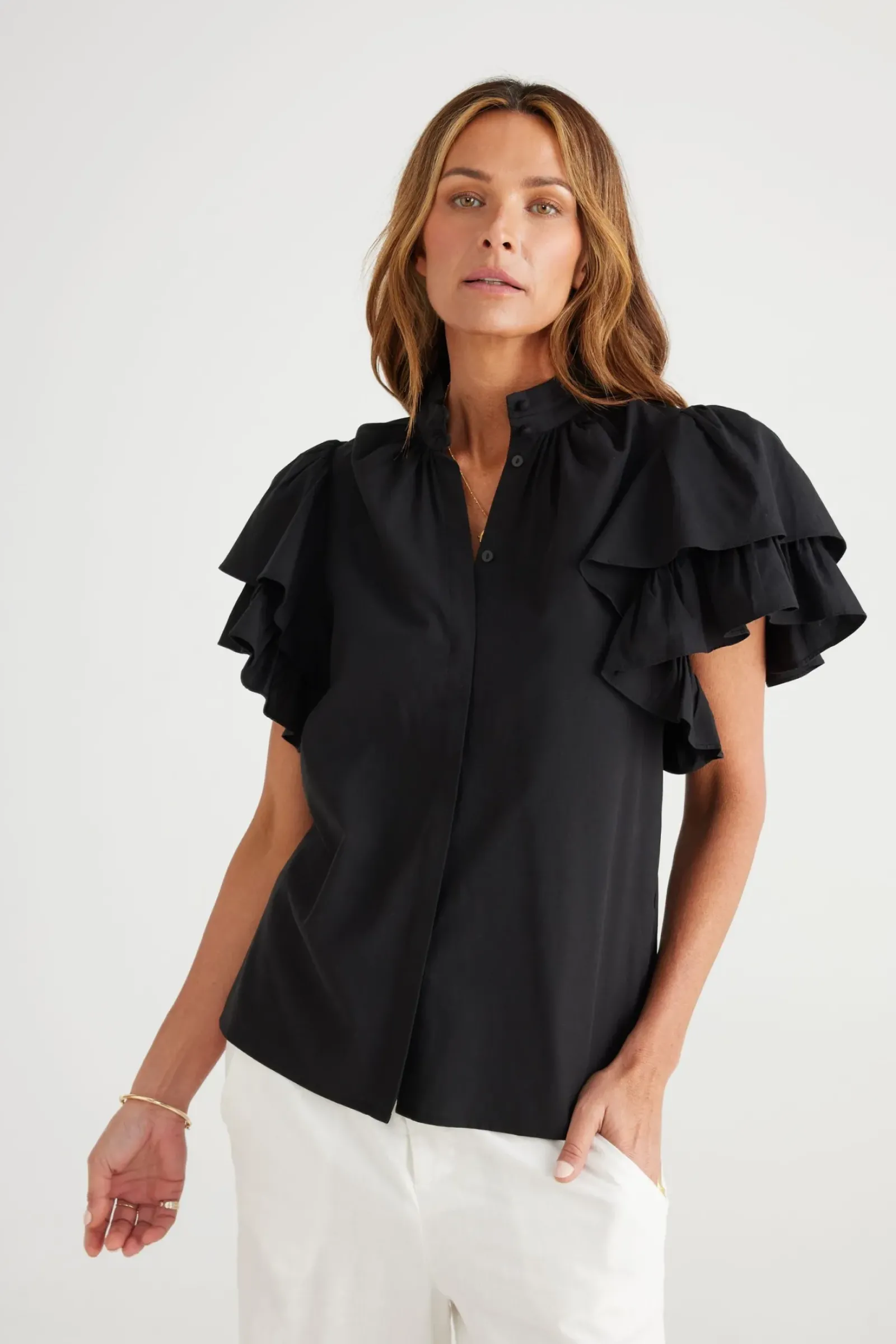 Layered, ruffled short sleeveHigh collar necklineConcealed buttonsRelaxed fitSOFT COTTON POLYESTER60% POLYESTER / 40% CO…
