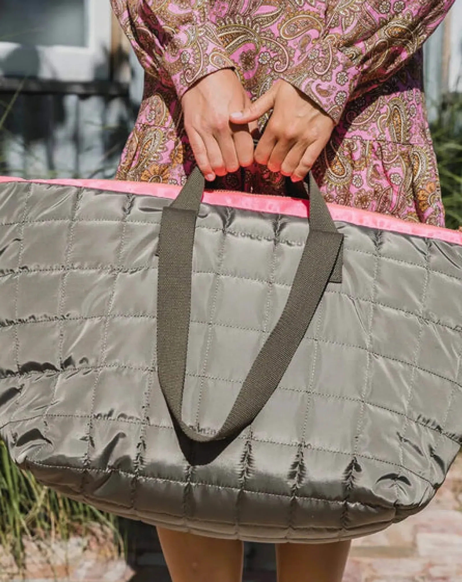 The Elms+King Spencer Carry All is the stylish weekend accessory we have all been dreaming of. With its two top-grip handles of varying drop height and an internal zip-pocket for ease of access, this Carry All can be used as a weekender, beach bag or everyday accessory for those of us always on the move. Made from premium quilted nylonwith14-karat light gold-plated hardware, the Spencer Carry All features a bright pop nylon lining.