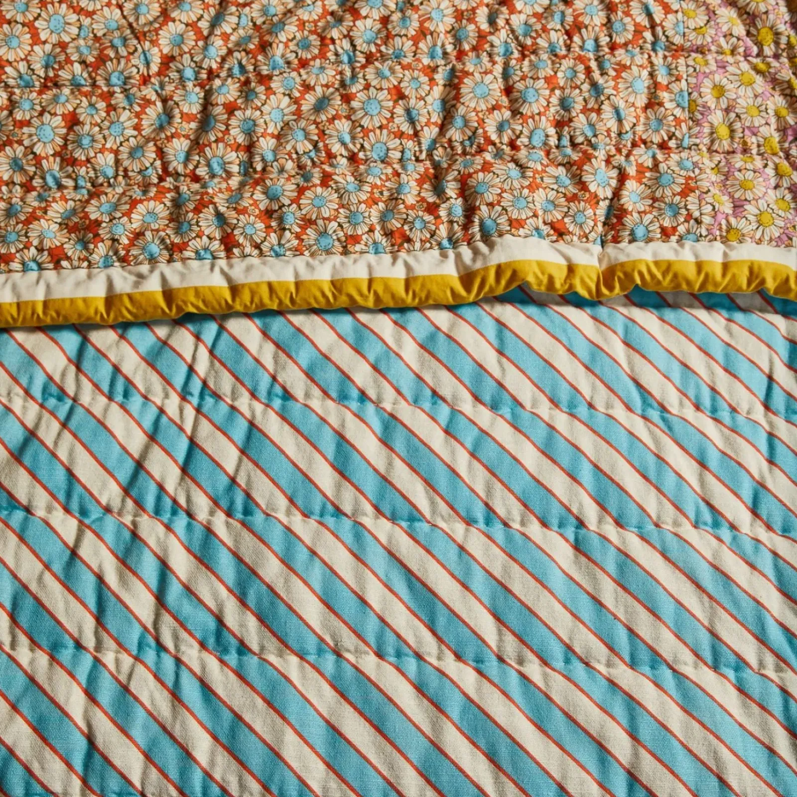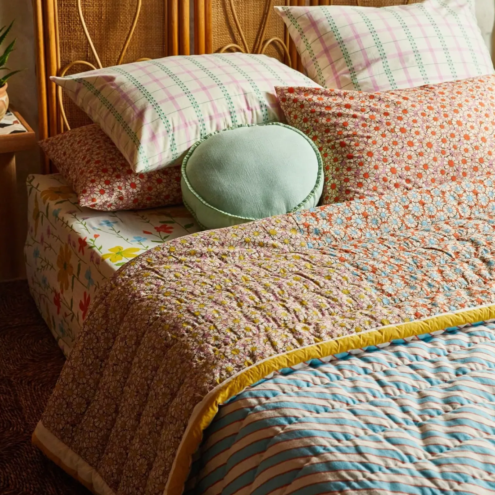 “Drawing on the nostalgic arts of patchwork and quilting, this plush and cosy bedcover offers two distinct looks in one. On one side, panels of dainty floral print in two complementary colorways bring the feel of thriving flower fields to life in your bedroom. On the other, slim diagonal stripes create a more timeless, soothing effect.” – Phoebe’s Style Notes