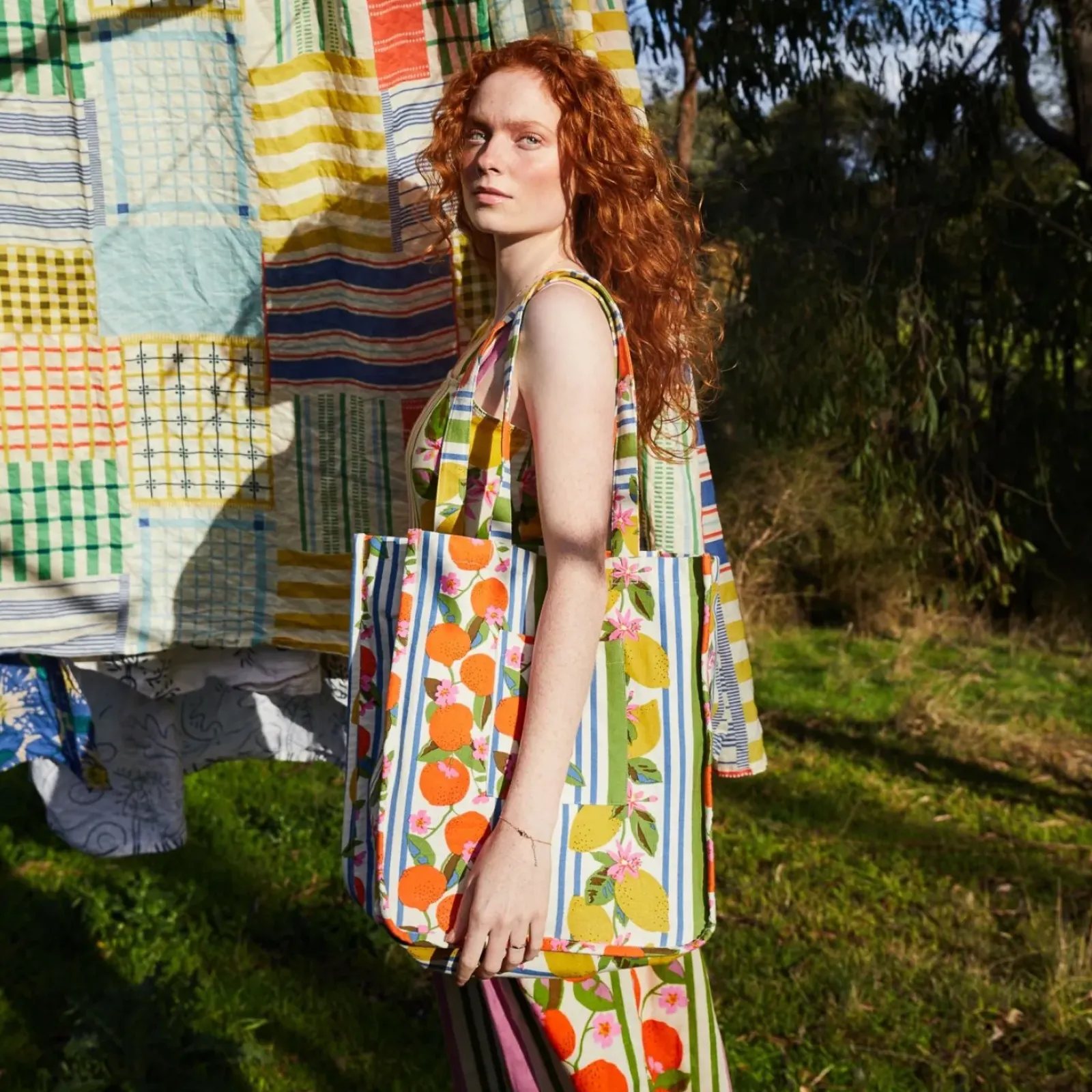 “Bursting with life and vibrant colour, this spacious tote bag is inspired by the abundance of a thriving orchard. Striped panels host ripe citrus motifs and verdant green leaves, creating a print that resembles vintage wallpaper or retro patchwork.” – Phoebe’s Style Notes