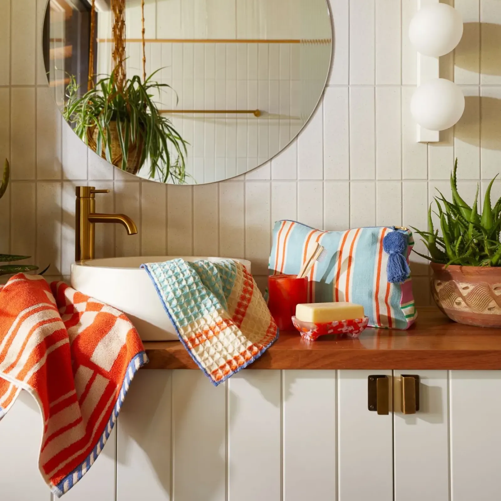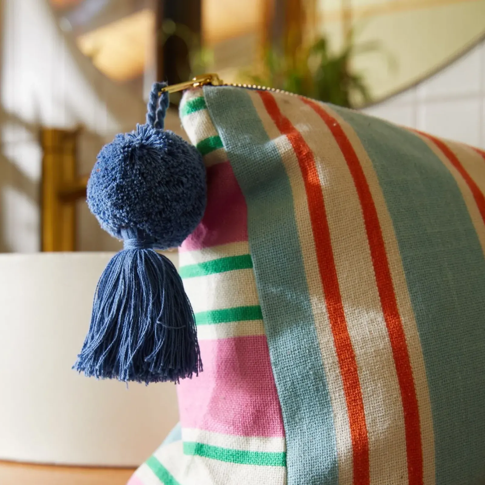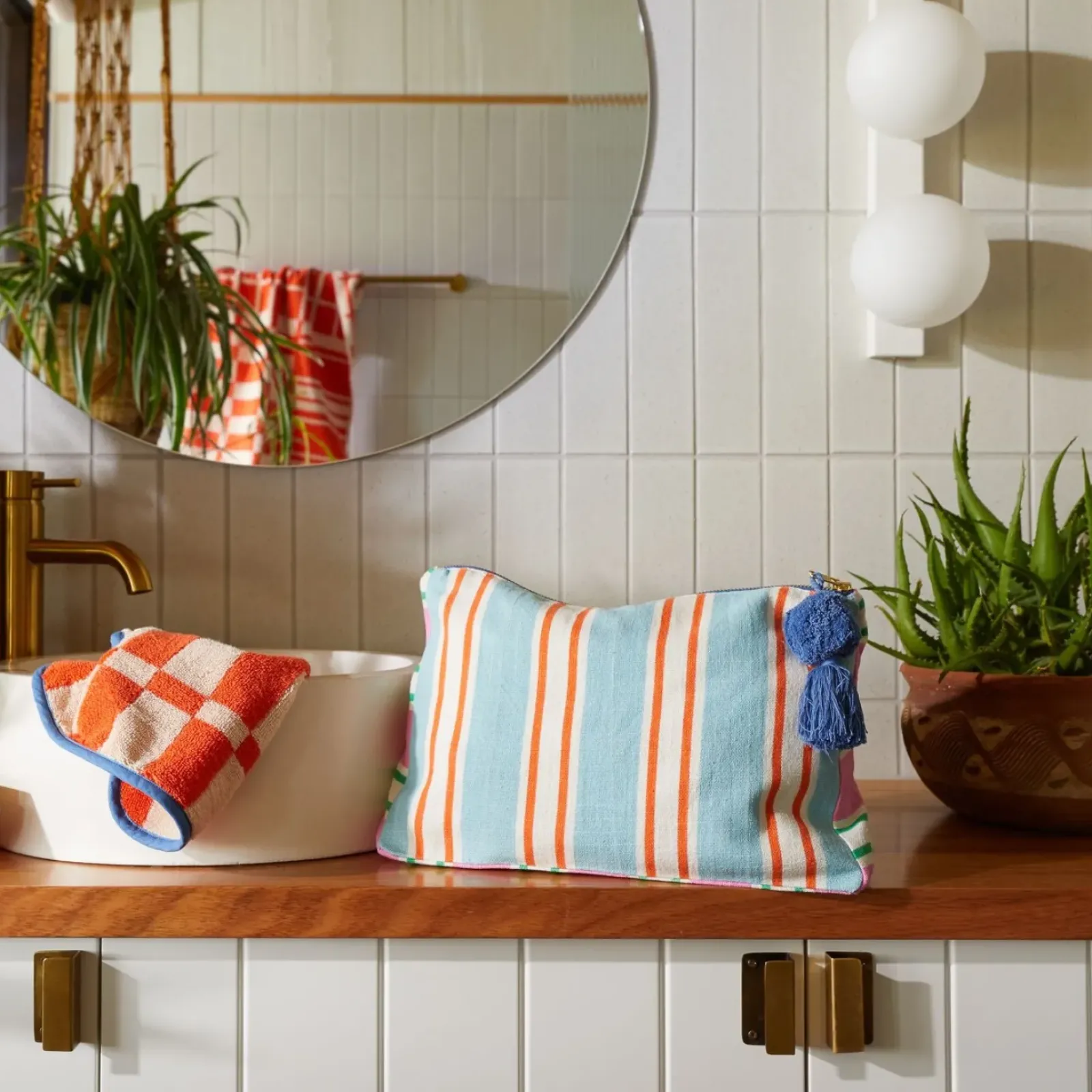 “The Tishy Cosmetic Bag is all about timeless prints, reinvigorated through unexpected and playful colour clashes. Two iterations of our vibrant striped fabric come together to create a patchwork-inspired colour-block effect, complemented by a bright top zip. It’s embellished with a textural pom pom detail to add that final touch of joy.” – Phoebe’s Style Notes