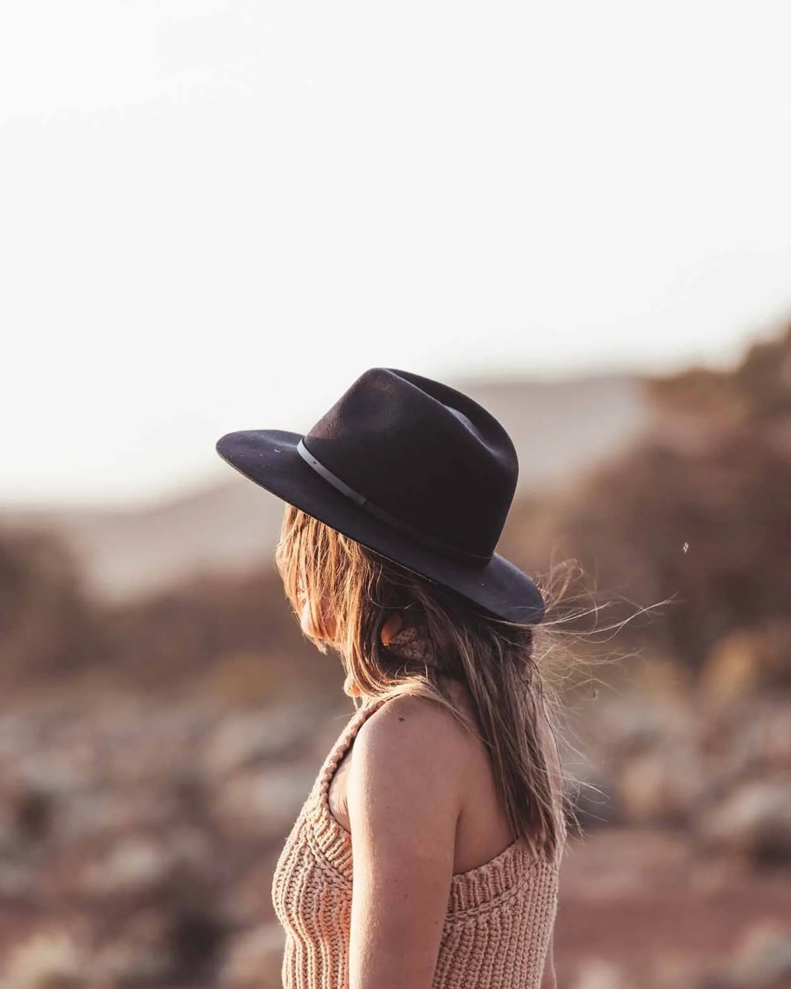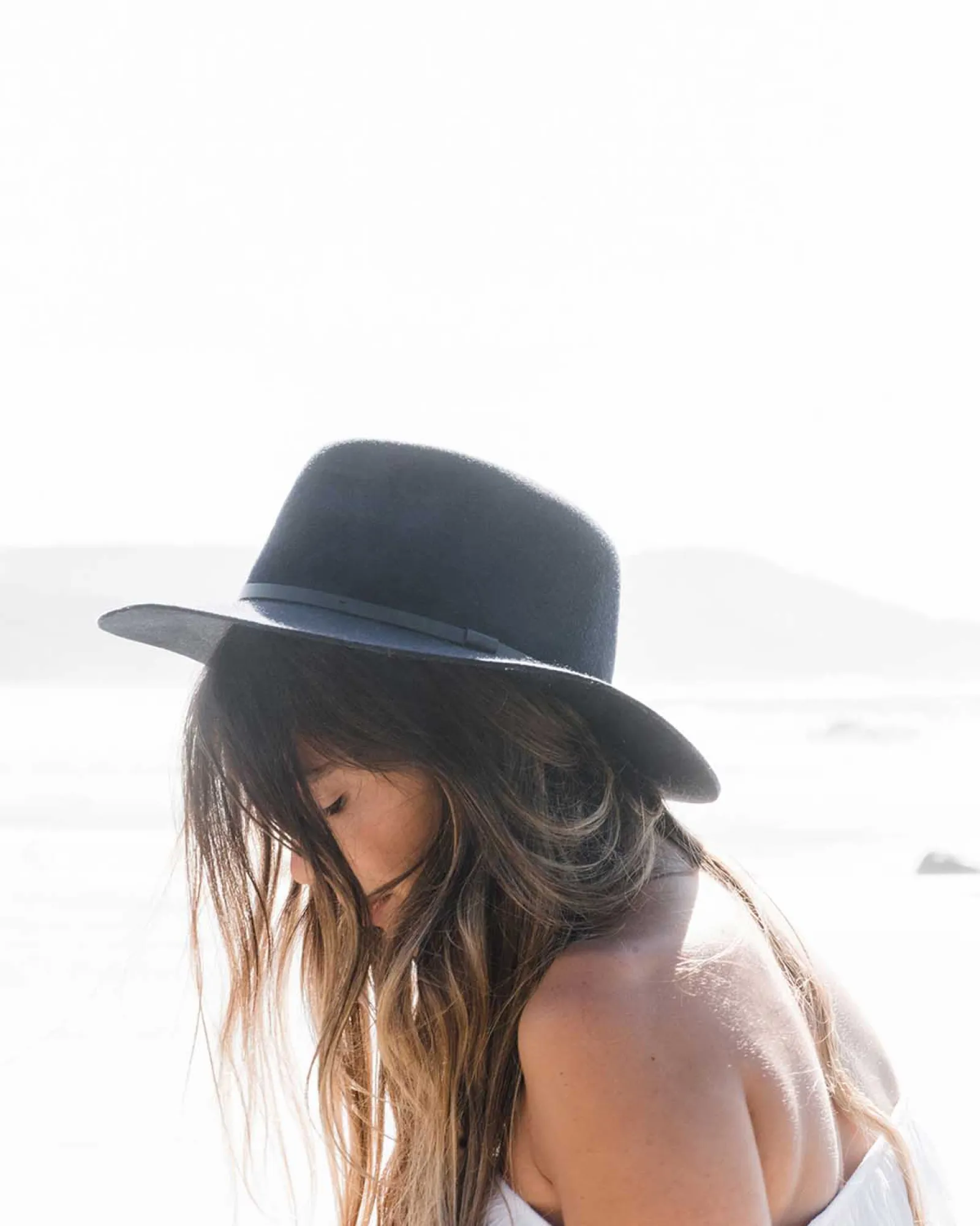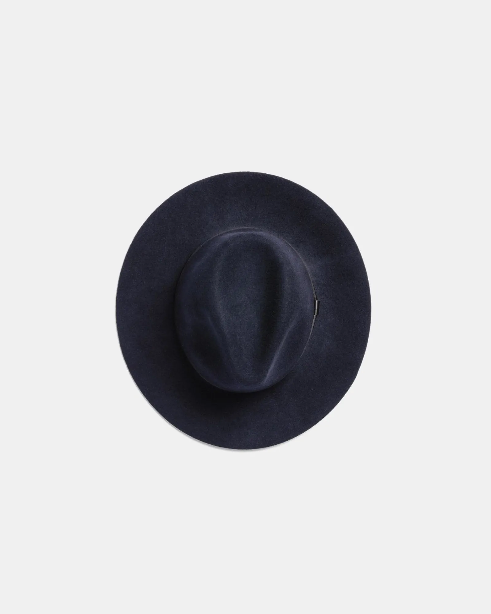 Anderson is a floppy wide brim fedora, made from super soft Australian wool. Navy blue hat trimmed with natural black leather.